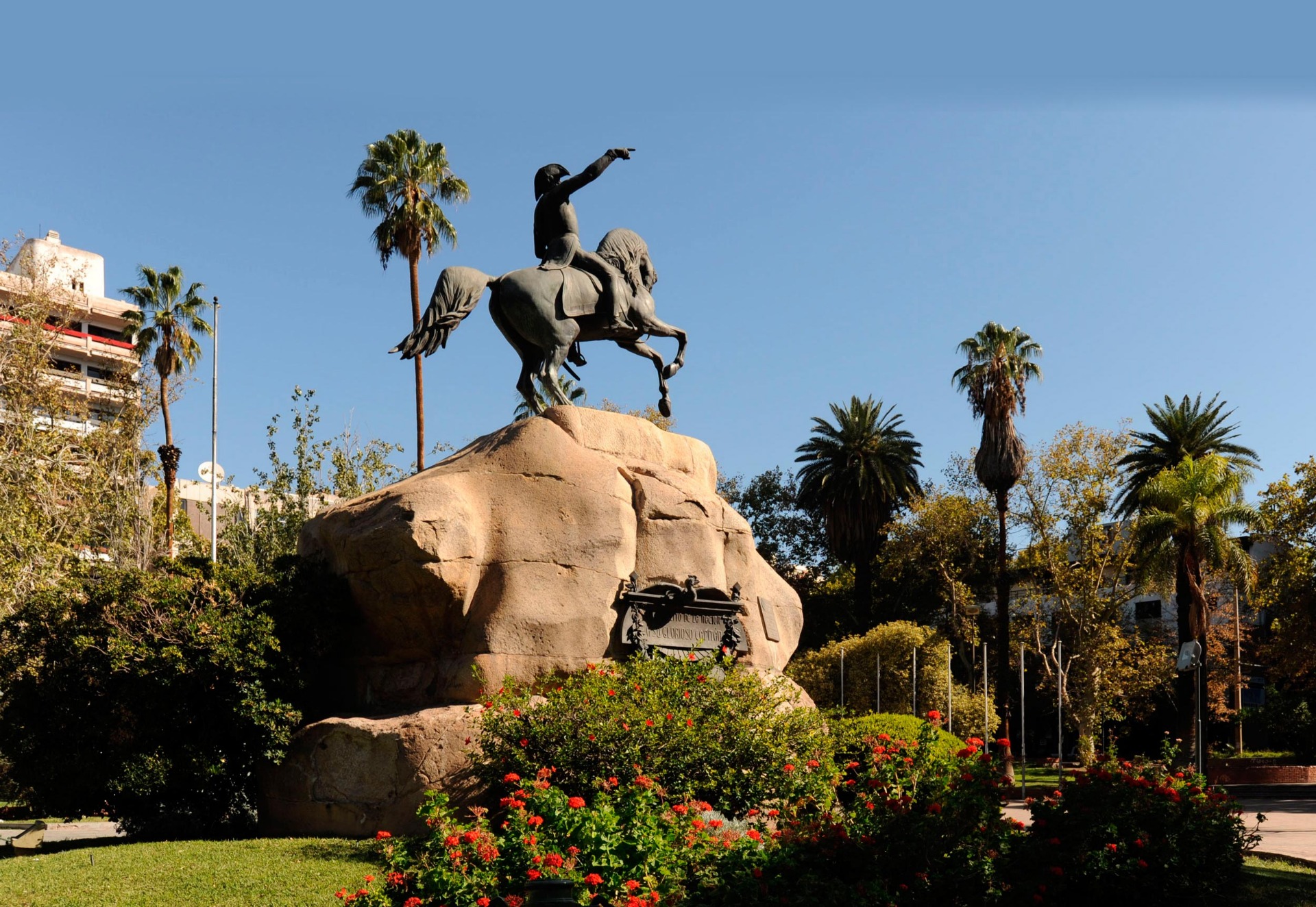Plaza verde y con paisajes, que alberga bancas a la sombra y una gran estatua ecuestre del General San Martín.